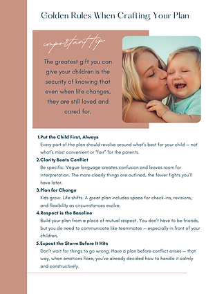 ✔️ Golden rules for creating your plan — simple, practical principles that keep your child at the center and help you communicate with your co-parent more effectively.